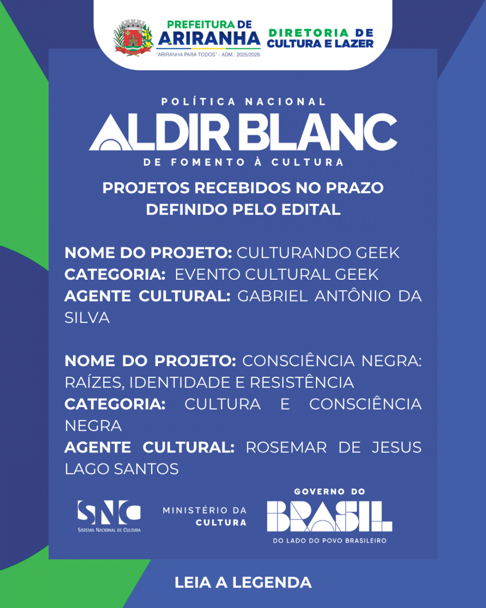 Ariranha divulga projetos inscritos no Edital PNAB 2026.