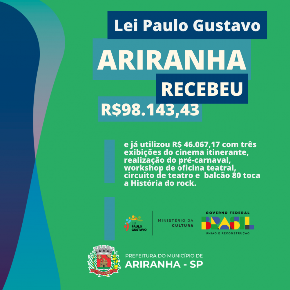 A cidade de Ariranha foi contemplada com R$98.143,43 através da Lei Paulo Gustavo, destinada a fomentar a cultura em todo o Brasil. Este recurso já está sendo utilizado para promover e fortalecer a cultura local.