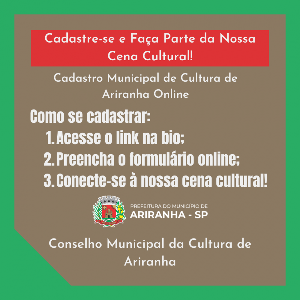 Bem-vindos, munícipes de Ariranha! Estamos empolgados em anunciar uma iniciativa que celebrará e fortalecerá a riqueza cultural de nossa cidade: o Cadastro Municipal de Cultura de Ariranha, agora disponível online. Esta plataforma visa conectar a comunidade, promovendo a diversidade artística que torna Ariranha única.