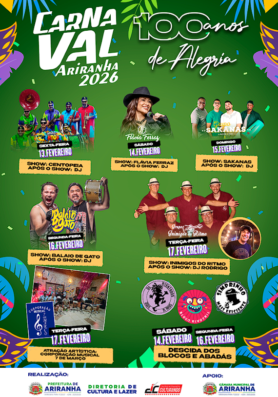 Programação com atrações musicais, descida dos blocos e abadás e apresentações para toda a família, valorizando aquilo que sempre fez do Carnaval de Ariranha uma referência: participação popular, organização e alegria.