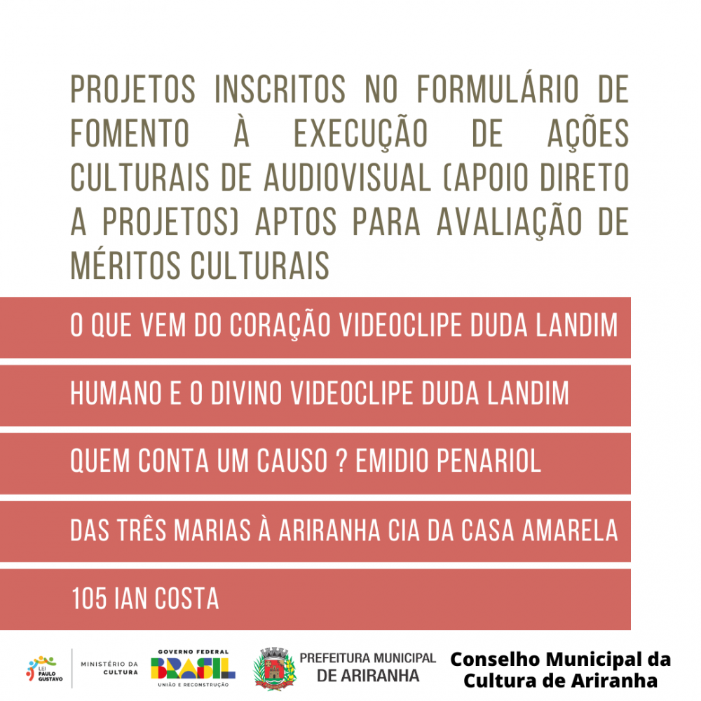 O Conselho Municipal de Cultura de Ariranha divulgou os projetos inscritos no formulário de Fomento à Execução de Ações Culturais de Audiovisual (Apoio Direto a Projetos) que estão aptos para avaliação de méritos culturais. Cinco projetos se destacam pela sua relevância e potencial de impacto na cultura local. São eles: