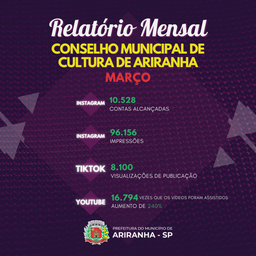 O Conselho Municipal de Cultura de Ariranha divulgou o relatório mensal de março, destacando os resultados obtidos nas redes sociais. No Instagram, o conselho alcançou um total de 10.528 contas, com impressionantes 96.156 impressões. Já no TikTok, as publicações alcançaram 8.100 visualizações. No YouTube, os vídeos foram assistidos um total de 16.794 vezes.