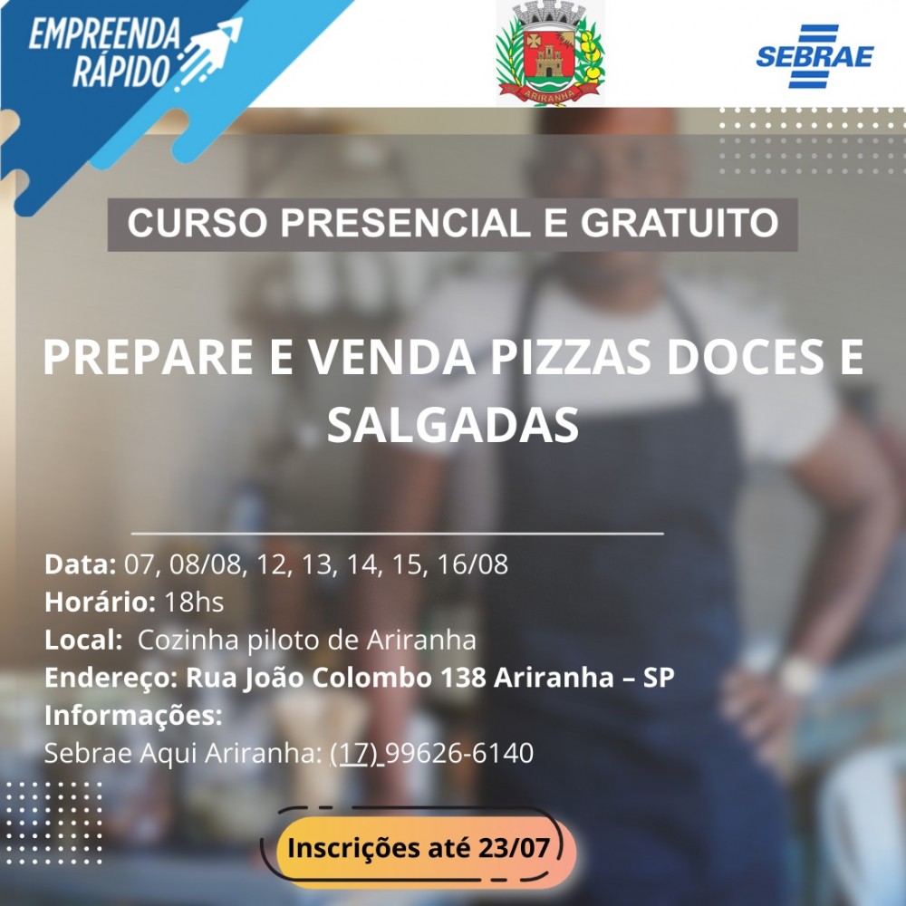 A Prefeitura de Ariranha, por meio da Diretoria de Indústria, Comércio e Habitação, em parceria com o SEBRAE, está com inscrições abertas para o Curso de qualificação profissional “Preparo e Venda de Pizzas Doces e Salgadas”. Você aprenderá a preparar massas básica e integral, recheios tradicionais para pizzas salgadas e doces.