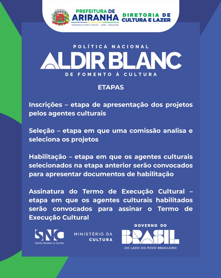 A Prefeitura de Ariranha, por meio da Diretoria de Cultura e Lazer, divulgou o cronograma de etapas para a execução da Política Nacional Aldir Blanc de Fomento à Cultura (PNAB) no município. O objetivo é garantir transparência e orientar os agentes culturais sobre o fluxo dos processos de seleção e repasse dos recursos.