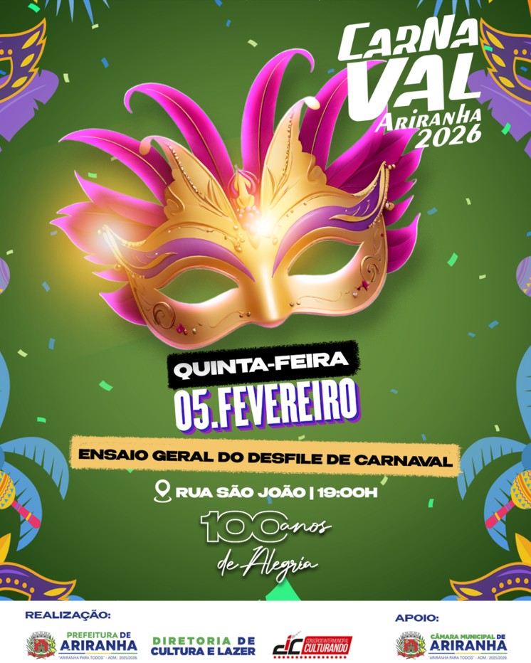 O Ensaio Geral do Desfile de Carnaval marca a contagem regressiva para os 100 anos de alegria do Carnaval de Ariranha.