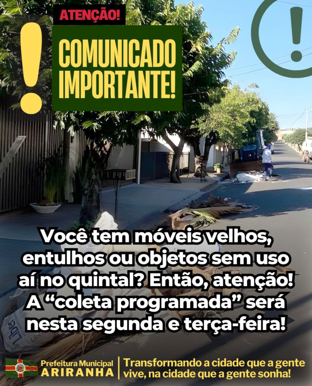 Você tem móveis velhos, entulhos ou objetos sem uso aí no quintal? Então, atenção! A Prefeitura de Ariranha vai recolher GRATUITAMENTE esses materiais inservíveis em todos os bairros.