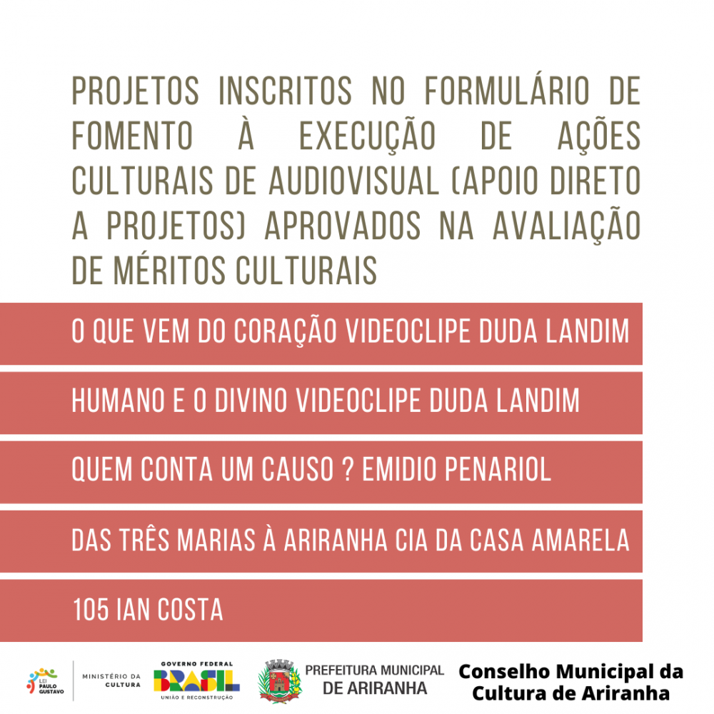 A cultura de Ariranha continua a florescer com a aprovação dos projetos no Fomento à Execução de Ações Culturais de Audiovisual. Dentre os selecionados, destacam-se produções que refletem a essência e a diversidade cultural do município. Confira os projetos aprovados: