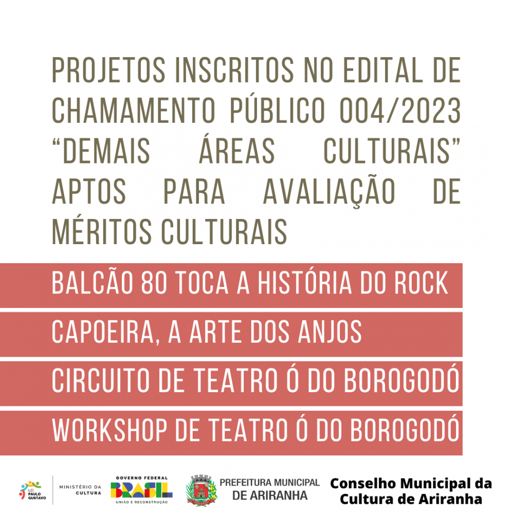 O Conselho Municipal da Cultura tem a honra de anunciar que os projetos inscritos no aguardado Edital de Chamamento Público 004/2023, voltado para as "Demais Áreas Culturais", estão agora prontos para serem avaliados quanto aos seus méritos culturais.