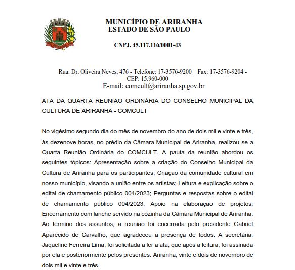 No dia 22 de novembro de 2023, às 19 horas, o prédio da Câmara Municipal de Ariranha foi palco da Quarta Reunião Ordinária do Conselho Municipal da Cultura de Ariranha - COMCULT. A reunião foi marcada por discussões e iniciativas que visam fortalecer e promover a rica cultura local.